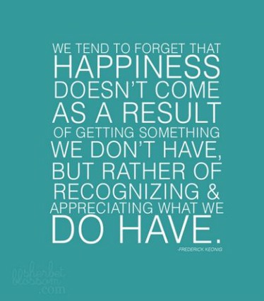 I tend to forget this more times than I care to admit. The endless pursuit of getting more and hoping, or even believing, that those things will fill me up and bring me the joy and happiness I am so desperately seeking can actually leave me feeling so empty and unfulfilled. It’s not that more is bad. It’s just that when we think of more as a means to happiness it will rarely, if ever, meet our expectations. In the past, I have actually believed that things like a front load washer and dryer, stainless steel appliances, granite countertops, a new car, a new house (I could go on and on) would bring me happiness. Sure, they were nice things, but they didn’t result in any kind lasting joy and happiness. In recognizing and appreciating the things we do have, especially those things we have that money cannot buy, we are reminded of just how rich we are in what matters most in life. We get to choose. Are we going to focus on seeking happiness in the “getting” or in the “recognizing” and “appreciating?”